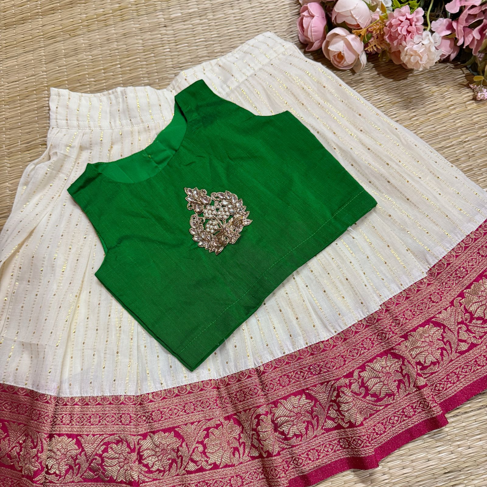 Material :- PINK ZARI BORDERED COTTON SKIRT AND DUPION BLOUSE